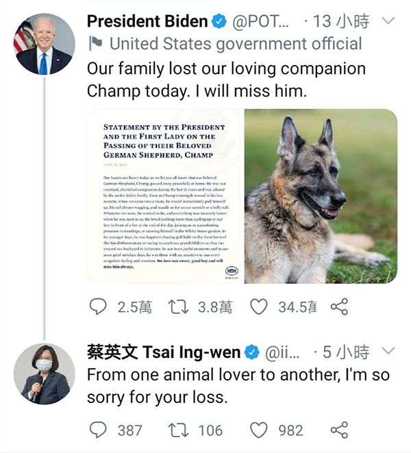 蔡英文悼念拜登愛犬。(圖片取自臺媒)