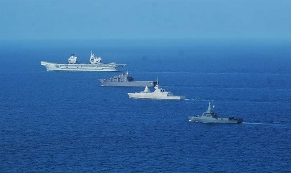 圖為英國“伊麗莎白女王”號與新加坡海軍進行會合演習。