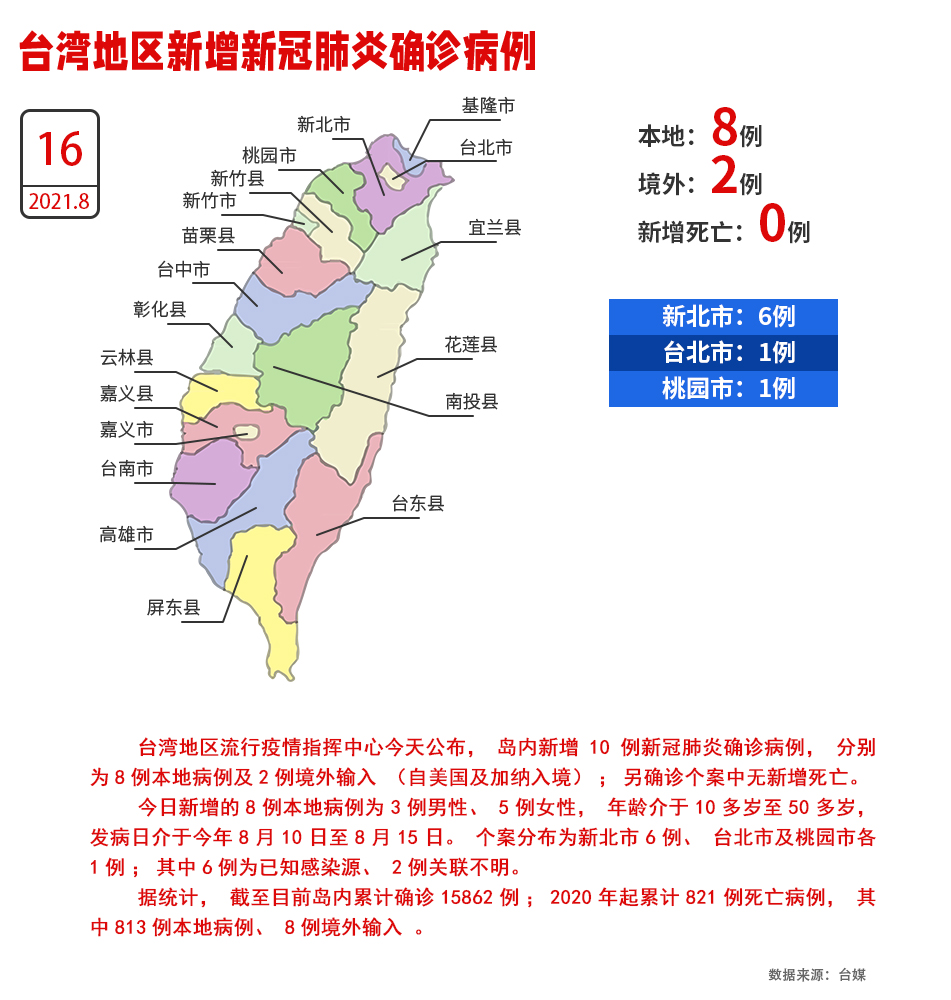 臺灣地區16日新增8例本地確診病例、2例境外輸入