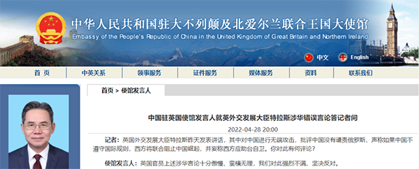 中國駐英國使館發言人就英外交發展大臣特拉斯涉華言論答記者問。(來源:中國駐英使館官網)
