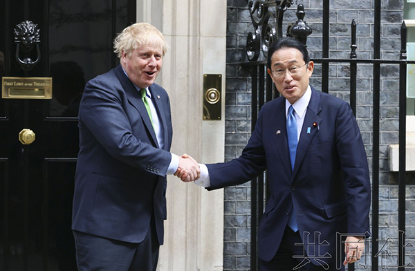 5月5日,日本首相岸田文雄和英國首相約翰遜(左)在會(huì)談前握手。(來源:日媒)