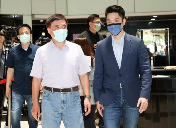 中國國民黨臺北市長參選人蔣萬安(右)昨天拜會臺北市前市長郝龍斌(前左),郝龍斌稱贊他現(xiàn)在對于市政已經(jīng)非常嫻熟。(圖片來源:臺灣《聯(lián)合報》)