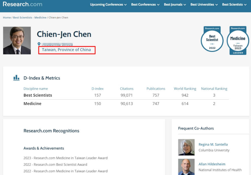 近期有島內(nèi)學(xué)者發(fā)現(xiàn),臺灣學(xué)者服務(wù)機(jī)構(gòu)被更改為“臺灣·中國的一省”(Taiwan,Province of China)。以臺行政主管部門負(fù)責(zé)人陳建仁為例,他在醫(yī)學(xué)領(lǐng)域排名臺灣第2、世界第614名,所屬機(jī)關(guān)為“臺灣研究院”,并標(biāo)注為“臺灣·中國的一省”。該網(wǎng)站也為大學(xué)排名,臺灣排名第1的臺灣大學(xué),同樣被標(biāo)注為“臺灣·中國的一省”。