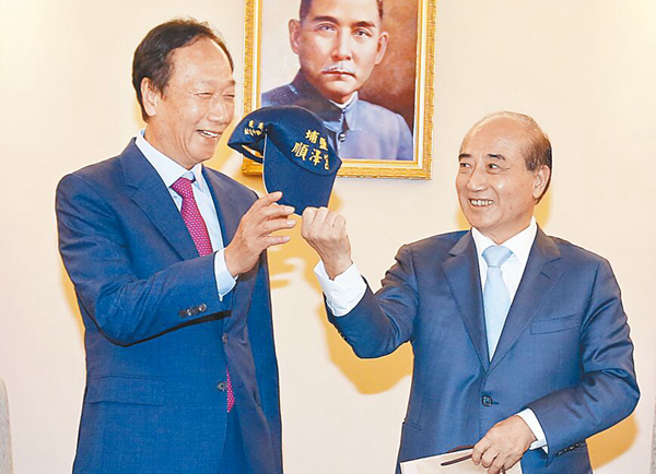 圖為郭臺銘日前拜會王金平并贈送月餅,王回贈郭帽子。(圖片來源:臺灣“中時新聞網”)