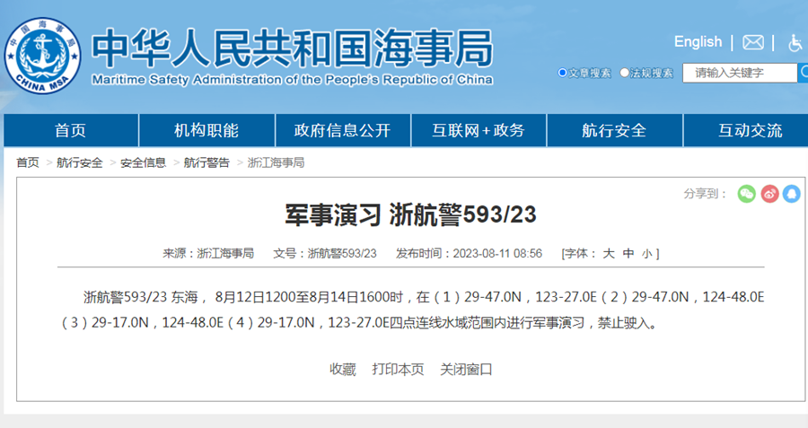 根據(jù)公告,浙航警表示,從8月12日中午12點(diǎn)到8月14日下午4點(diǎn),于下列坐標(biāo)(1)29-47.0N,123-27.0E(2)29-47.0N,124-48.0E(3)29-17.0N,124-48.0E(4)29-17.0N,123-27.0E四點(diǎn)連線水域范圍內(nèi)進(jìn)行軍事演習(xí),禁止駛?cè)搿?/div>