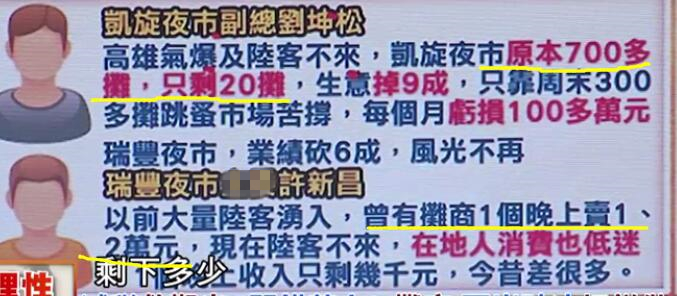 臺媒也曾報道過臺灣其他夜市的慘狀,比如凱旋夜市原本700多的攤位,如今只剩20攤,不少店家整排座位只有2、3個人,每個月還要面臨高達100多萬(新臺幣,下同)的虧損;瑞豐夜市也好不到哪兒去,以前陸客大量涌入之時,有攤主1晚上能賺2萬,如今能賺幾千就是好的了。