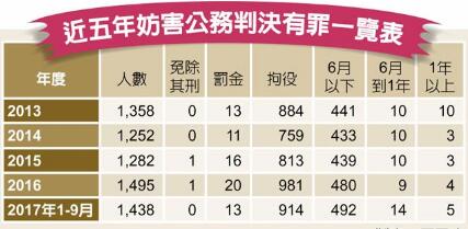 統計指出,2013年到今年9月,近5年因觸犯“妨害公務罪”而被判有罪的共6825人;判決有期徒刑6個月以上要入監服刑人數僅78人,其中2013到2016年,每年約13到20人,今年前9個月共19人,僅占這5年全部有罪人數比例的1.1%,其他98.9%涉犯“妨害公務罪”者,都是判處罰金、拘役和6月以下徒刑。