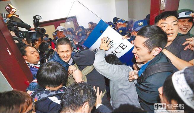 圖為反服貿學生沖入“行政院”辦公室內,與衛警發生嚴重推擠的畫面。(圖片來源:臺灣《中時電子報》)