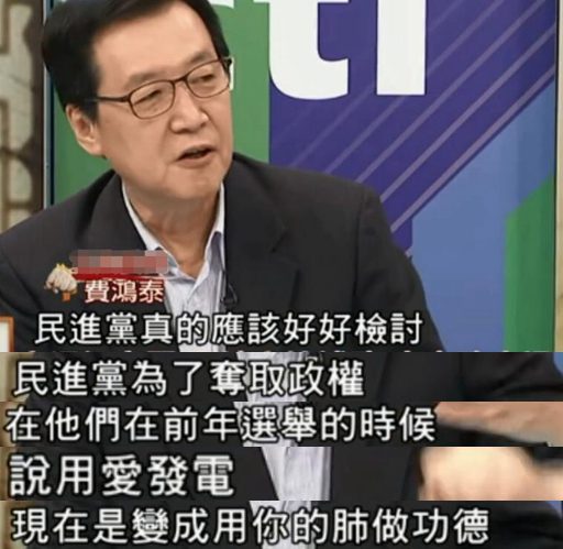 知名政論評論人費鴻泰也表示,民進黨真的應該好好檢討下,選舉時說好的“用愛發電”,如今卻變成“用肺做功德”。