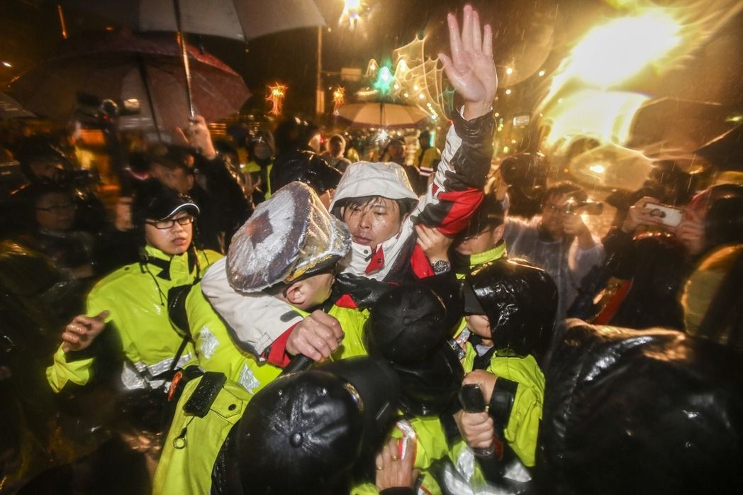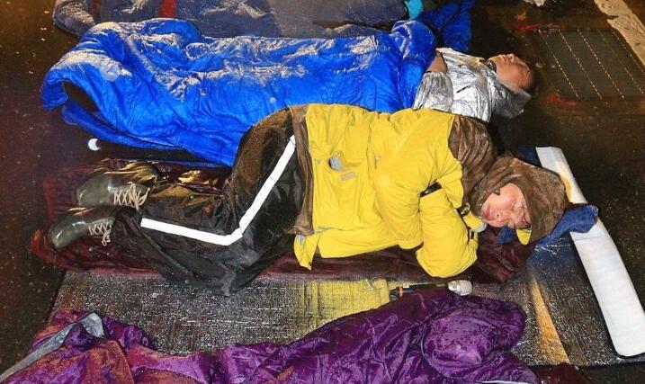 在禁食行動實(shí)施超過24小時后,6日晚間6時50分“時代力量”五位“立委”又利用雷射投影器材將熒光綠色的“退回勞基法”五個字投影到蔡辦外墻上,宣示反對勞基法再修法的決心;不久后這出“小綠”尬“大綠”的戲就到了高潮的一幕——7日凌晨約0點(diǎn)10分,因不滿第二頂帳篷遭警方強(qiáng)行拆除并“代為保管”,“時代力量”的黃國昌與徐永明等5名“立委”憤而直接躺在雨中睡覺!
