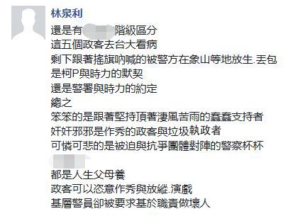 據(jù)臺灣《中時電子報》報道,黃國昌稍早時還在臉譜網(wǎng)(facebook)表示,“很久很久沒有如此難過”,不是因?yàn)槿頋窭洹⒉皇且驗(yàn)槌^40小時未進(jìn)食、而是因?yàn)楸緛硪詾?016改變已經(jīng)發(fā)生,“沒有想到我所熱愛的臺灣權(quán)柄的濫用,竟然依舊如此冷酷”;而當(dāng)警方不斷柔性勸導(dǎo)其早點(diǎn)“離開休息”時,他又反唇相譏“你不要再演戲了”!