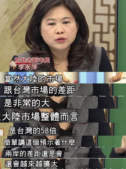 前臺北市副市長李永萍也坦言,如今大陸的市場是臺灣市場的58倍,“簡單的講,這預示著兩岸間的差距會越來越大”。
