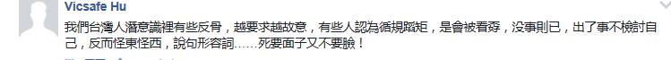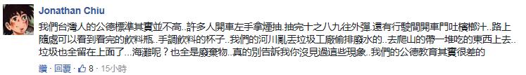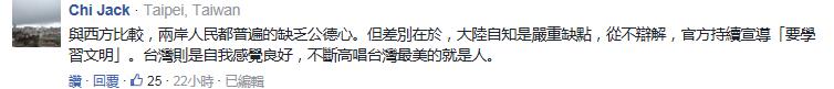 崗山之眼的不文明游客行徑一經(jīng)曝光便引發(fā)了許多臺(tái)灣網(wǎng)友的談?wù)摚?strong>其中很大一部分人認(rèn)為臺(tái)灣人的公德標(biāo)準(zhǔn)確實(shí)不高,需要改進(jìn),“臺(tái)灣人本來就沒有比較優(yōu)越,作過服務(wù)業(yè)的就知道”、“以前在機(jī)構(gòu)服務(wù)最討厭的就是臺(tái)灣人”。