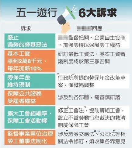 另外,這次游行的主軸除上述“勞權‘公投’”以外,還對勞工薪資制度的不合理提出了要求和抗爭,包括要求連續三年“加薪10%”,希望“修法”通過,以實現共計三年內為勞工調薪三成。