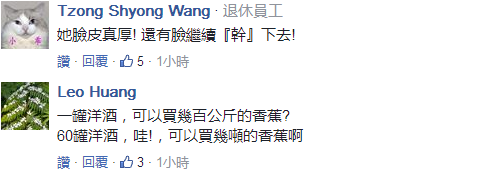 再來說送禮的內容,洋酒。以往蔡英文曾被爆料愛吃法國大餐,這回吳音寧送禮送洋酒算是對上了。只不過你吳音寧口口聲聲說要支持本土農產品,霸占道德高地,到頭來卻做起了洋酒“生意”,不覺得臉疼嗎?下面這位臺灣網友說出了大部分人心里的感受: