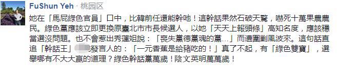 臺灣包袱鋪,音寧是個小白兔~在侃爺眼里,北農總經理吳音寧絕對是個“曠世奇才”!從春節休市風波開始,她就一直以強勢的“霸屏”之姿占據臺灣各大新聞版面的頭條,并一路衍生出了“250萬(新臺幣,下同)高薪實習生”、公費送菜贊助家鄉以及摸彩活動,在過去的一周,她又接連被爆出視察產地時大吃魚翅宴以及拿業務推廣費送民進黨臺北市黨部60瓶洋酒的“綁樁案”。盡管引發了無數爭議,但她卻還是被贊“有達到專業標準”……