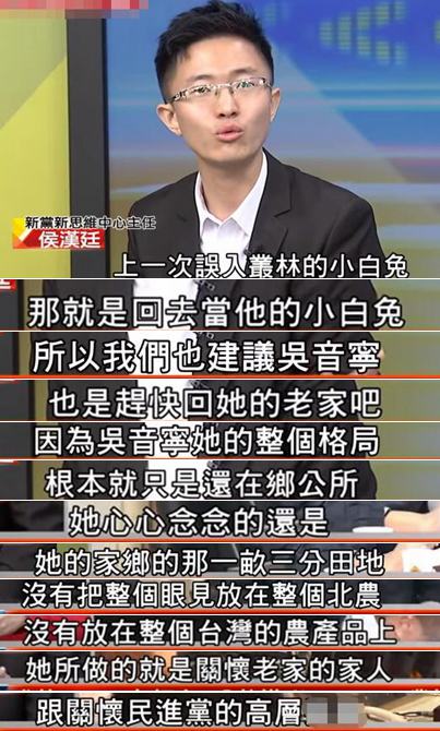 新黨新思維中心主任侯漢廷就說,既然是“誤入”那就哪兒來回哪兒去吧,反正吳音寧也沒有把心思放在北農和臺灣的農產品上;