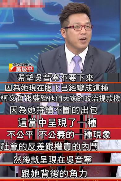 民進黨民代黃偉哲也在政論節目中舌戰“懟吳團”,不僅說吳音寧品操沒問題,從沒做過“自我圖利”的事兒,還指責外界明明沒有把所謂“公關費”的制度建好,卻還硬要先把吳音寧“斗臭斗倒斗垮”。