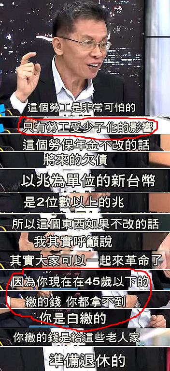 沈富雄指出,勞保年金受少子化影響,若照現行制度來看,將來的欠債是2位數以上的、以兆為單位的新臺幣。他還強調,現在臺灣45歲以下勞工繳的錢,其實都是為退休老人家準備的,為此也建議55歲以上的勞工可以加減繳費,55歲以下不要交,“我帶你們去革命”。