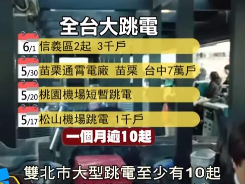 據臺灣《中國時報》報道,從4月起,包括花蓮、高雄、苗栗、臺北和新北等地皆頻發跳電和停電事故,其中苗栗通霄電廠5月30日發生的輸電線路跳脫故障,致使苗栗及臺中約7萬多戶停電。有數據統計,僅五月份,臺北和新北地區就跳電了11次!
