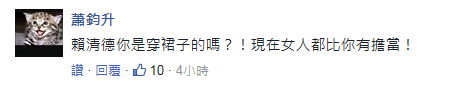 不料此話一出,即遭網友打臉,“天天鞭尸馬英九,那選你們上臺干嘛,找借口誰都會,下次選頭豬好了!”還有人對賴清德的性別持懷疑態度,“‘賴院長’難道穿的是裙子?話說現在的女人都比你有擔當……”“喜歡打太極?那年底就讓你們下臺!”