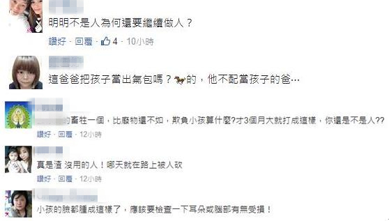 對此,臺灣網友十分憤怒,“明明不是人為何還要繼續做人?”“把孩子當出氣包嗎?不配當爸爸”“畜生一個,欺負小孩算什么”,還有好心網友提醒:“小孩的臉都腫成這樣了,應該要檢查一下耳朵或者腦部有無受損。”