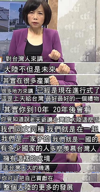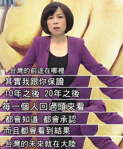 當現在越來越多的臺灣人意識到他們的未來與出路在大陸時,臺灣或許還有“救”。黃智賢對此就很喜聞樂見,她表示也許10年、20年后,臺灣人回頭看會發現,能把自己貢獻在整個大陸的發展中,是上天給臺灣最好最好的禮物;黃智賢更強調,兩岸同文同種,“我們就是一國的,多少國家羨慕臺灣人擁有這樣的機遇”、“臺灣的未來一定在大陸”!