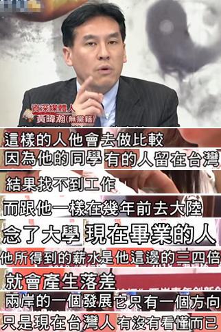 對此黃暐瀚也指出,親身經歷了大陸發展變化的臺灣青年會對兩岸現今的發展狀況產生落差,更強調兩岸的發展只有一個方向,“只是現在臺灣人有沒有看懂而已”。