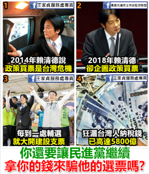 “(臺灣選舉)用鈔票換選票的思惟并沒有改變。最低層級的是候選人買票;再來是縣市長候選人,不分藍(lán)綠開空頭支票,加起來每年總共要多支出七百多億元(新臺幣,下同)。”