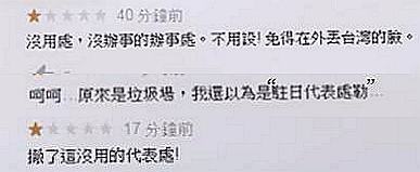 如此傲慢冷漠的態度也讓日本人看不下去了。有臺媒報道,位于東京都的“臺北駐日經濟文化代表處”在“Google”上的評價中甚至出現許多日本人用日文大肆批評的聲音,“態度非常糟糕,這就是臺灣的服務嗎?”、“接待水平真糟糕,對臺灣來說真的是一種恥辱”、“工作態度傲慢、這里的服務太離譜了,氣死我了”、“這就是臺灣人?我討厭臺灣人!”……