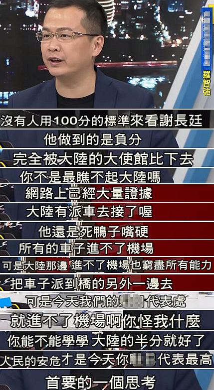 馬辦前秘書長羅智強也一語中的地指出——謝長廷做到的根本是負分!更直言,謝長廷這次被“最瞧不起的大陸”完全比下去了,“你能學到大陸的半分就好”!