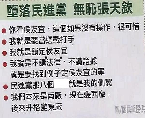 “連他自己都承認自己是東廠”,國民黨文傳會代理主委唐德明在分析后指出,張天欽的言論透露出四點算計:打擊侯友宜選情、架空“主委”黃煌雄、陰謀詭計幫助選、踐踏民主仇恨報復!他表示在民主的臺灣,還自評為鷹犬、自甘為打手,“這就是仇恨蒙蔽眼睛”。