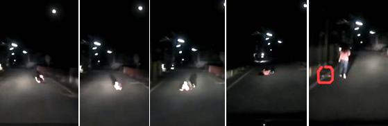 沒想到該女子竟不死心,先是向左翻了一圈,眼見原PO沒反應,又向右滾了兩圈,還一手將鞋子丟出,想營造車禍現場,但原PO依舊完全不為所動……后來女子實在演不下去了,加上場面太尷尬,只好起身小跑步逃離現場。過程中,女子一度想轉身撿回鞋子,但見原PO還在,只好頭也不回繼續跑,最后消失在黑暗中。