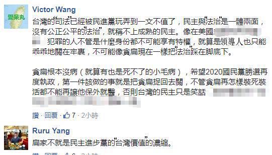 更有人表示“讓阿扁回監已是人民共識,否則臺灣‘司法’蕩存”,但不少人則是哀嘆,由阿扁一人已可見證“臺灣‘司法’已死”、“臺灣‘司法’被民進黨玩弄到一文不值”;