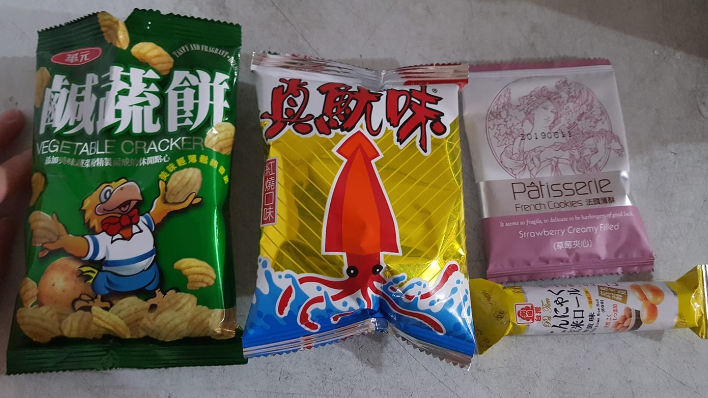 根據(jù)照片,4包餅干分別是“咸酥餅”、“真魷味”、草莓夾心的法國薄酥及日式餅干。