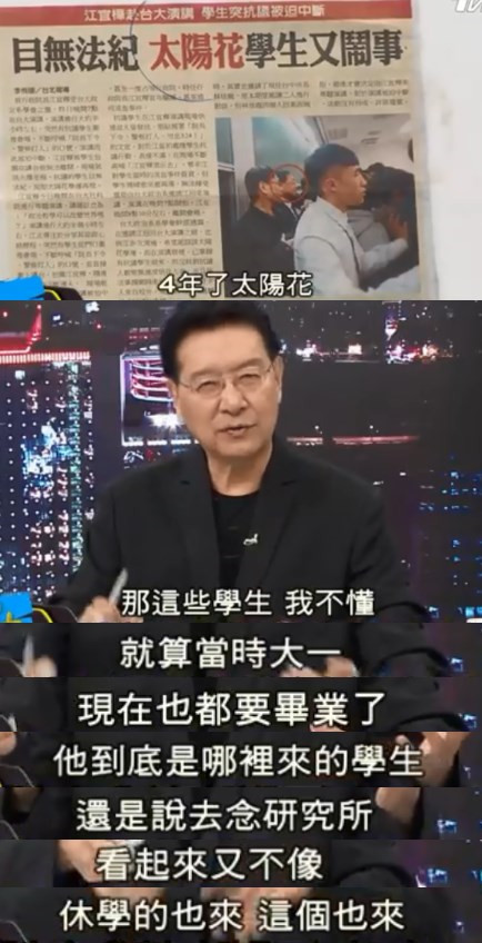 媒體人趙少康在節(jié)目中表達了很多人的一個困惑。來鬧事的人號稱是“太陽花學運”的學生,拜托,“太陽花”發(fā)生在四年前,就算你當時是大一新生,也該畢業(yè)了吧?