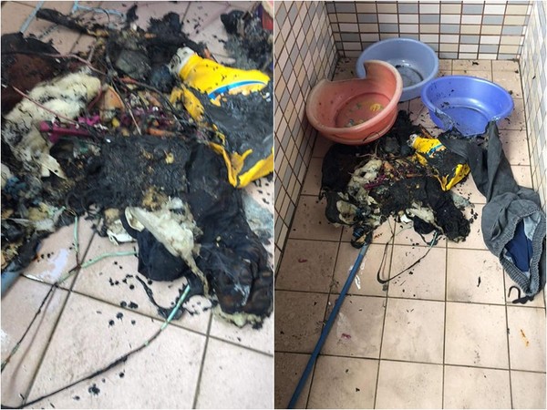 該網友21日上午10時許在臉譜網上曬出照片,并發文表示“請問今早經過仁武八德西路熱鬧的廟會,你們放鞭炮差點把我們家燒了知道嗎?”照片中可以看見,曬在陽臺外的衣物全被燒成灰燼,連擺放在外的臉盆也不堪高溫被燒的變形,所幸網友弟弟因感冒待在家中及時發現撲滅火勢,讓他嚇得直呼“還好我弟在家。”