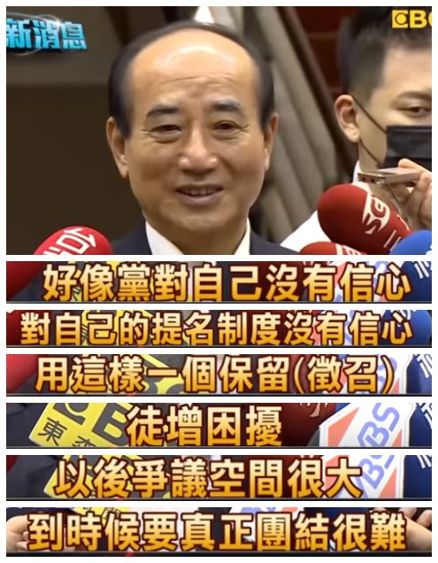 對于保留征召的作法,王金平在接受專訪時表達了強烈的質疑,王金平并直言,若初選后再征召,一定衍生很大的爭議并造成很多變量,“如果有人要往這方向沖,黨不會真正團結”。