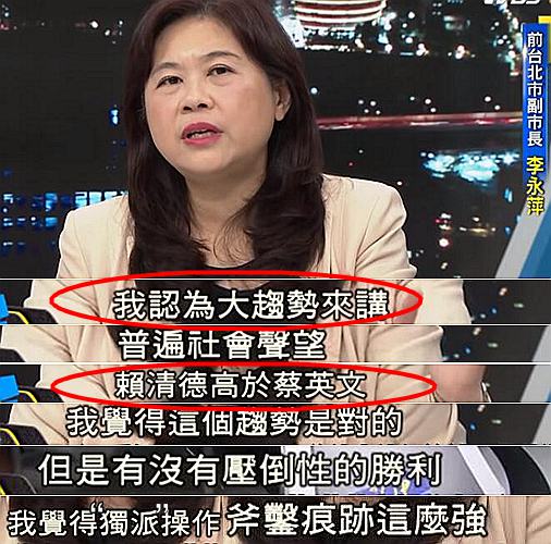 前臺北市副市長李永萍則認為,從大趨勢而言,賴清德的社會聲望高于蔡英文,這點沒問題,但如此“壓倒性的勝利”,只能說是“獨派”操作的痕跡太重,這于民進黨的選情不是件好事。