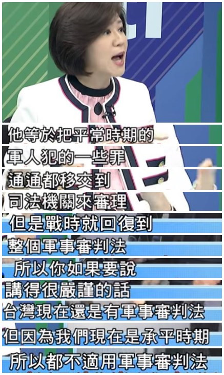 國民黨民意代表表示,有軍法,更準確地表述是,平時沒有,戰時有。非戰時,處理軍隊法律糾紛由臺灣司法機關承擔;一旦處于戰爭狀態,則由軍法處理。