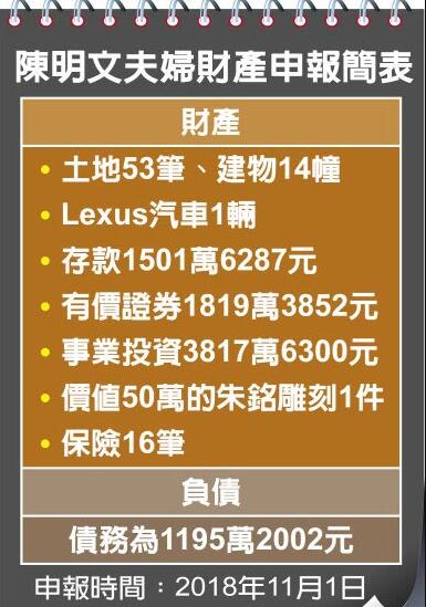 其中,光是土地,陳明文夫妻就有遍及臺北市、臺中市、嘉義市、嘉義縣等縣市數(shù)十筆,土地總計登記持有4萬1千多平方公尺!而在事業(yè)投資部分,總金額高達(dá)3800多萬元的財產(chǎn)中,遍及開發(fā)、建設(shè)、投資公司等,地點(diǎn)則是遍布新北市、臺中市、嘉義縣、市等。