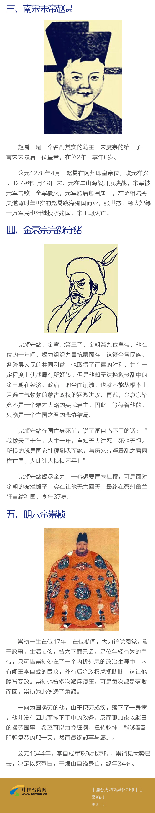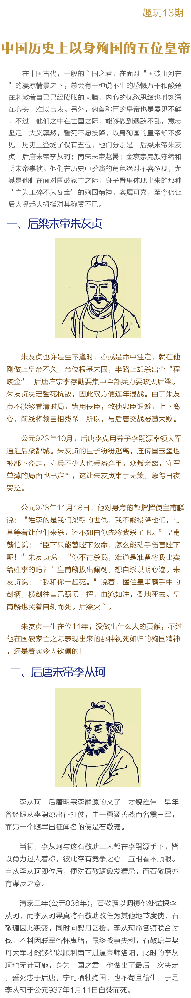 在中國古代,一般的亡國之君,在面對“國破山河在”的凄涼情景之下,總會有一種說不出的感慨萬千和酸楚在刺激著自己已經膨脹的大腦,內心的憂愁思緒也時刻涌在心頭,難以言表。另外,俯首稱臣的皇帝也是屢見不鮮,不過,他們之中在亡國之際,能夠做到遇敵不亂,意志堅定,大義凜然,誓死不愿投降,以身殉國的皇帝卻不多見,歷史上登場了僅有五位,他們分別是:后梁末帝朱友貞;后唐末帝李從珂;南宋末帝趙昺;金哀宗完顏守緒和明末帝崇禎。他們在歷史中扮演的角色絕對不容忽視,尤其是他們在面對國破家亡之際,身子骨里體現出來的那種“寧為玉碎不為瓦全”的殉國精神,實屬可嘉,至今仍讓后人豎起大拇指對其稱贊不已。