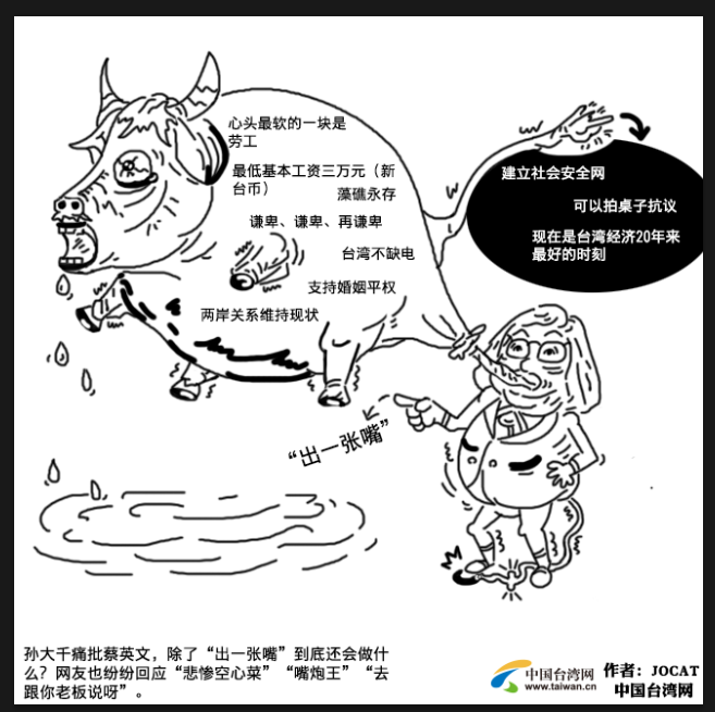 據臺灣《中時電子報》報道,臺灣地區領導人蔡英文日前在民進黨候選人造勢場合致辭時呼吁選民,絕對不能把選票投給“只出一張嘴”、讓臺灣走回頭路的政黨。國民黨前“立委”孫大千10月29日在臉譜網(facebook)發文諷刺,蔡英文口中所說的只會出一張嘴的人,不就是你自己嗎?