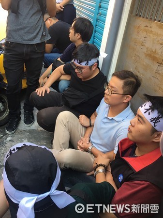 國(guó)民黨青年黨工阻擋“執(zhí)行署”查封黨工宿舍。(圖片來(lái)源:臺(tái)灣“東森新聞云”)