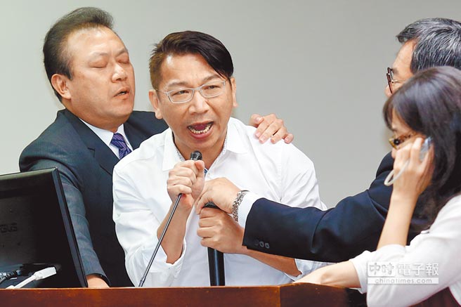 徐永明(中)占據質詢臺要求復議期過后才初審,持續僵持不下,民進黨“立委”蘇震清(左)與陳明文(右)上臺軟性規勸,依舊無法順利開會,晚間蘇、陳兩人合力把徐永明架出議場外。(圖片來源:《中時電子報》)