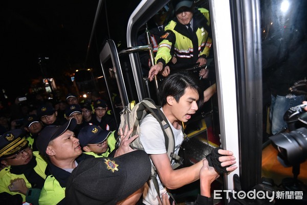 抗議勞團民眾4日晚間被警方驅散后,改往蔡英文辦公室附近散步,但仍遭警方包圍,強制帶上警車。(圖片來源:臺灣“東森新聞云”)