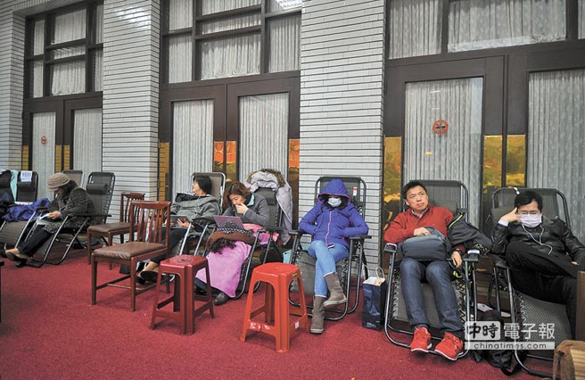 民進黨“立法院”黨團為確保能搶先送案,防止在野黨的案海攻勢,“綠委”們冒著寒流在“立法院”議場門口輪班排隊。(圖片來源:臺灣《中時電子報》)