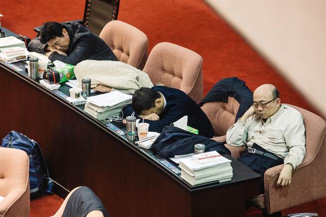 臺“立法院”徹夜審“勞基法”,有“立委”抵抗不了濃濃睡意,在底下睡成一團。(圖片來源:臺灣《中時電子報》)