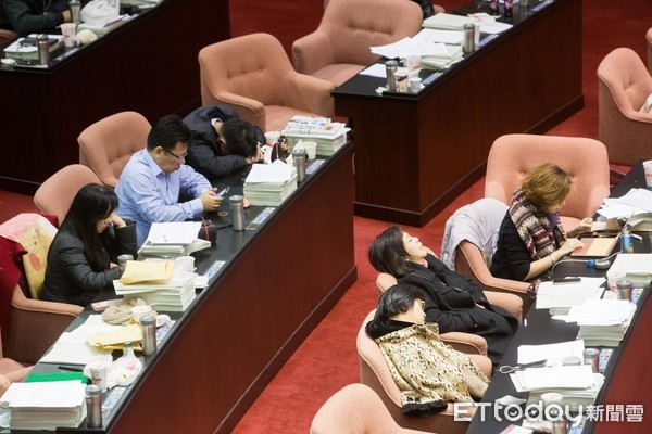 臺灣“立法院”針對“勞基法”修訂進入凌晨,臺下多名“立委”已經睡著,形成過勞修“勞基法”的現象。(圖片來源:臺灣《中時電子報》)