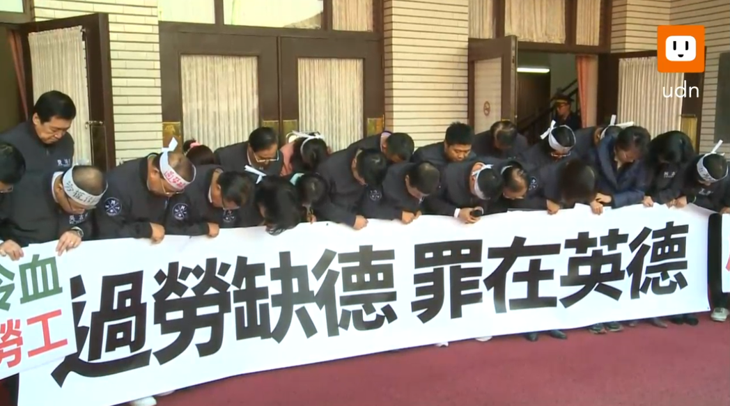 國民黨團在會后向勞工朋友鞠躬道歉,表示已經盡力了。(圖片來源:臺灣“聯合新聞網”)